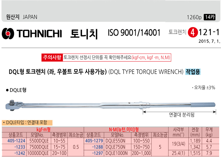 [TOHNICHI/Åä´ÏÄ¡] DQLEÇü ÅäÅ©·»Ä¡(7500DQLE 15~75kgf.m/DQLE750N 150~750NM, Á¿캼Ʈ °â¿ë)(Torque Wrench)