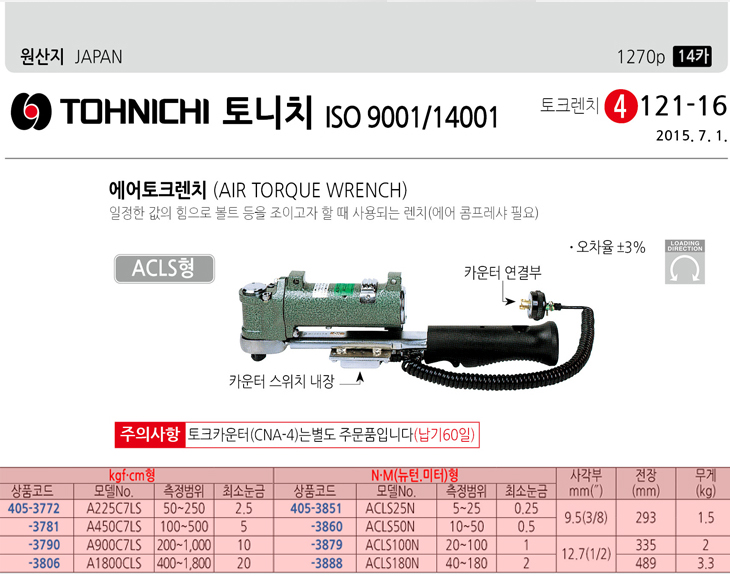 [TOHNICHI/Åä´ÏÄ¡] ACÇü ¿¡¾îÅäÅ©·»Ä¡(A1800C 400~1800kgf.cm/ACLS180N 40~180nm)(Air Torque Wrench)