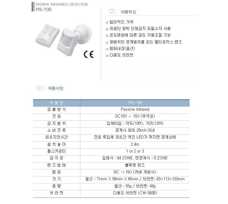 [HT] ¿­¼±°¨Áö±â(PIS-700, ÀÔüŸÀÔ 100µµ/12¹ÌÅÍ, ´Ù¿ëµµ ºê¶óÄÏ Æ÷ÇÔ)(Passive Infrared Detector)