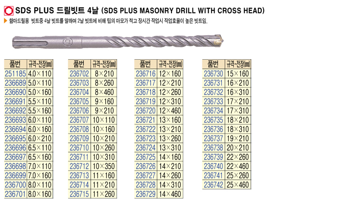 [UDT] SDS PLUS µå¸±ºøÆ®4³¯(SDS PLUS MASONRY DRILL WITH CROSS HEAD) 11x260mm