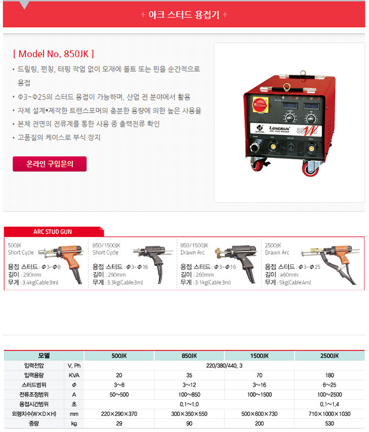 [¿ùµåÀ£] º¼Æ®¿ëÁ¢±â/¾ÆÅ© ½ºÅÍµå ¿ëÁ¢±â(850JK, ½ºÅ͵åÁ÷°æ:3~12ÆÄÀÌ, 35KVA, 230/380/440V¿ë)(Stud Welding Machine)