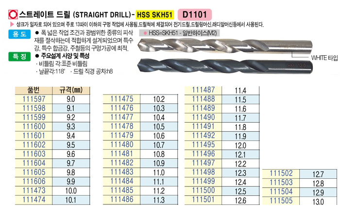 [YG]½ºÆ®·¹ÀÌÆ® µå¸±(STRAIGHT DRILL)-HSS SKH51 D1101(10.8mm~11.1mm)