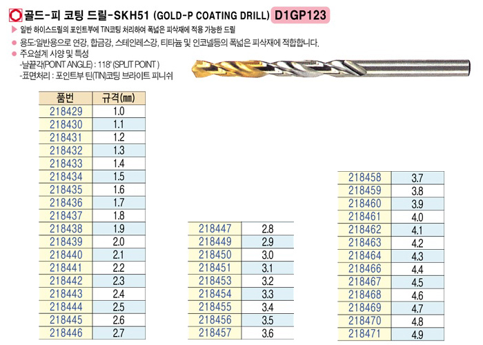 [YG]°ñµÎ-ÇÇ ÄÚÆÃ µå¸±-SKH51(GOLD-P COATING DRILL)D1GP123(3.2mm~3.5mm)