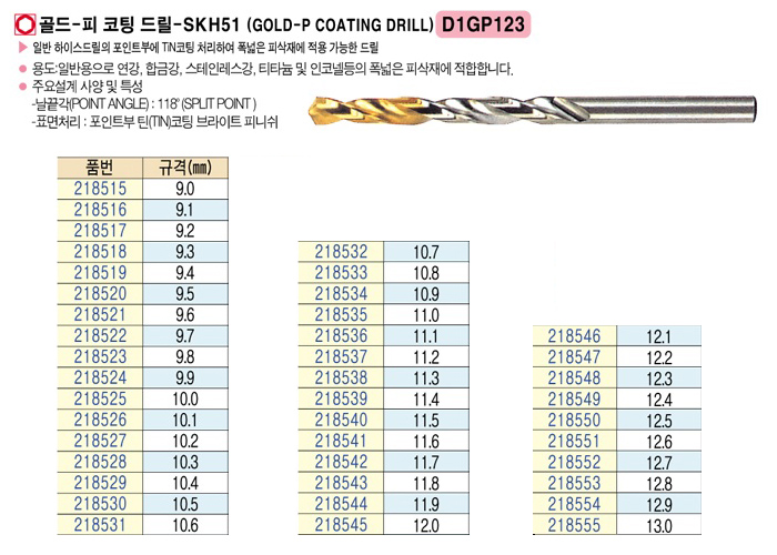 [YG]°ñµÎ-ÇÇ ÄÚÆÃ µå¸±-SKH51(GOLD-P COATING DRILL)D1GP123(10.4mm~10.7mm)