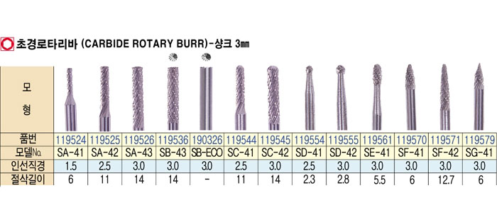[¿ÍÀÌÁö¿ø] Ãʰæ·ÎŸ¸®¹Ù (CARBIDE ROTARY BURR)-¼§Å©3mm SD-41 ~ SG-41