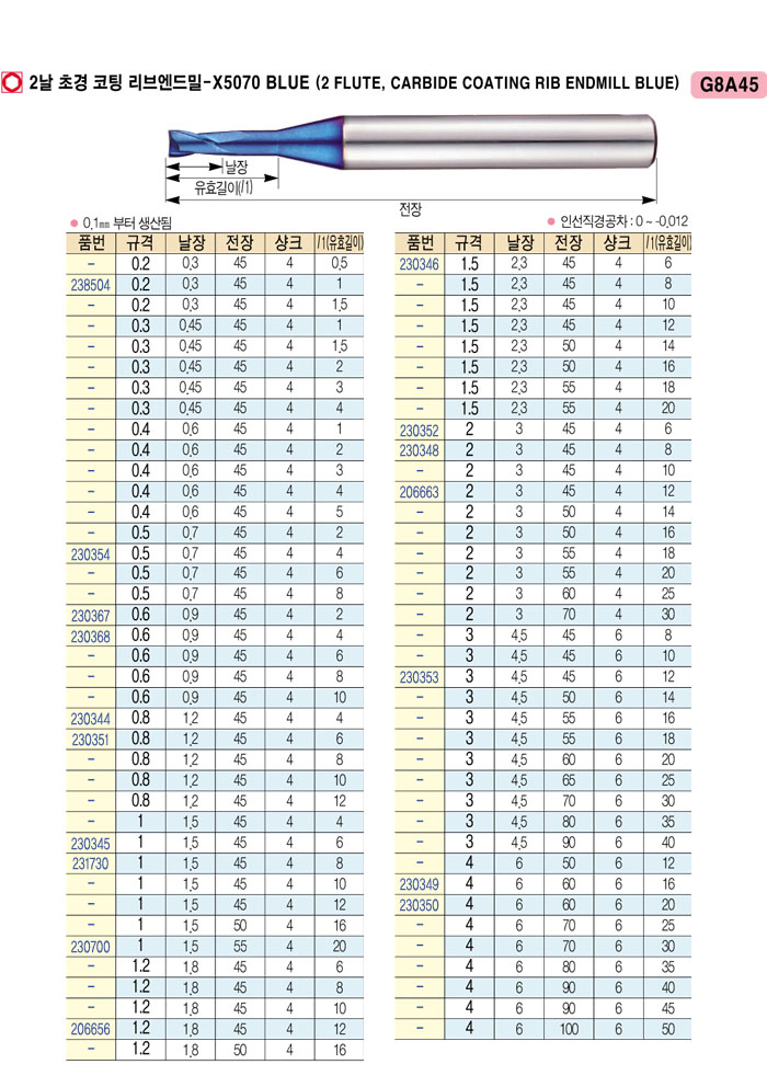 [¿ÍÀÌÁö¿ø] 2³¯ Ãʰæ ÄÚÆÃ ¸®ºê¿£µå¹Ð-X5070 (2 FLUTE, CARBIDE COATING RIB ENDMILL) ³¯Àå3 À¯È¿±æÀÌ12 ~ ³¯Àå4.5 À¯È¿±æÀÌ12
