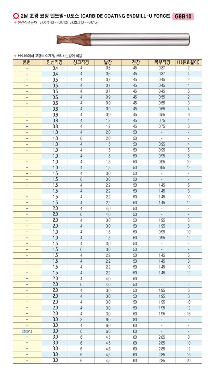 [¿ÍÀÌÁö¿ø] 2³¯ Ãʰæ ÄÚÆÃ ¿£µå¹Ð-UÆ÷½º (CARBIDE COATING ENDMILL-U FORCE) ³¯Àå3.0 À¯È¿±æÀÌ16 ~ ³¯Àå4.5 À¯È¿±æÀÌ20