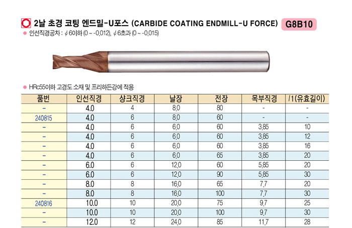 [¿ÍÀÌÁö¿ø] 2³¯ Ãʰæ ÄÚÆÃ ¿£µå¹Ð-UÆ÷½º (CARBIDE COATING ENDMILL-U FORCE) ³¯Àå12.0 À¯È¿±æÀÌ30 ~ ³¯Àå20.0 À¯È¿±æÀÌ28