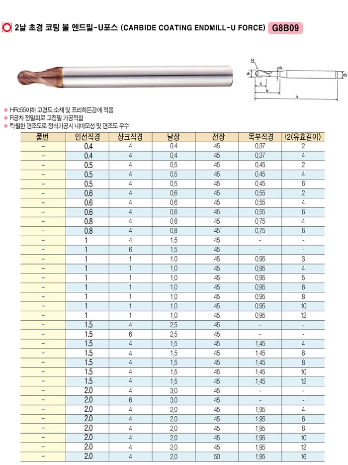 [¿ÍÀÌÁö¿ø] 2³¯ Ãʰæ ÄÚÆÃ º¼ ¿£µå¹Ð-UÆ÷½º (CARBIDE COATING ENDMILL-U FORCE) ¼§Å©Á÷°æ6 ³¯Àå3.0 ~ ³¯Àå2.0 À¯È¿±æÀÌ16