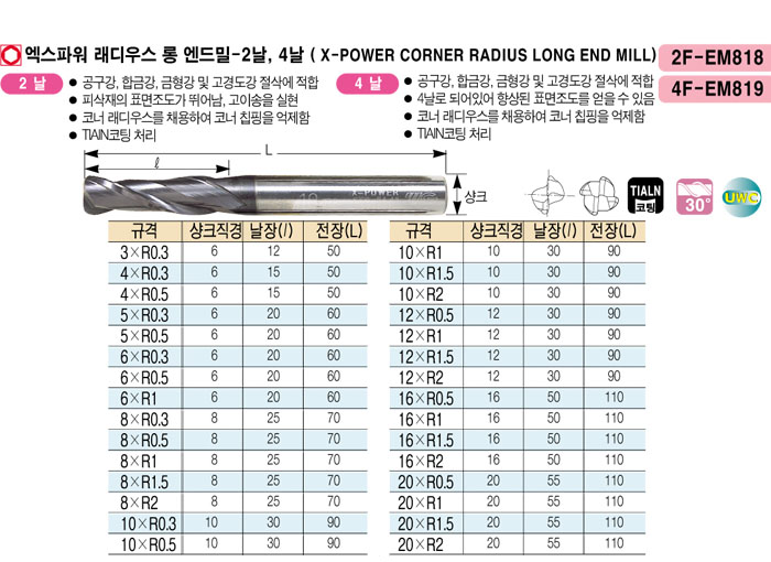 [¿ÍÀÌÁö¿ø] ¿¢½ºÆÄ¿ö ·¡µð¿ì½º ·Õ ¿£µå¹Ð (X-POWER CORNER RADIUS LONG END MILL) 8¡¿R1 2F ~ 10¡¿R0.5 4F