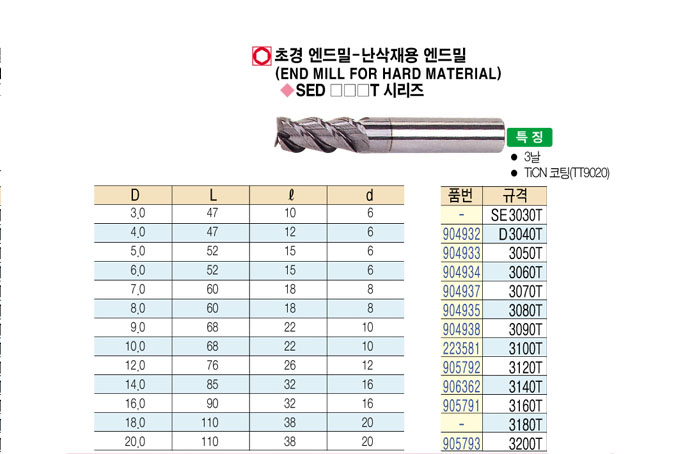[´ë±¸ÅØ] ÃÊ°æ ¿£µå¹Ð-³­»èÀç¿ë ¿£µå¹Ð (END MILL FOR HARD MATERIAL) SED 3030T ~ SED 3090T