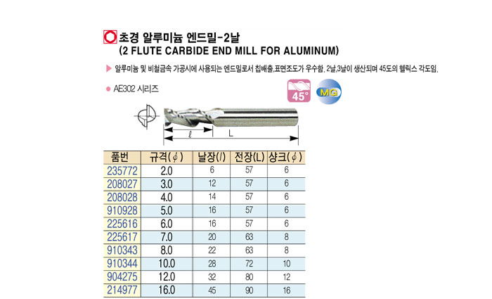 [ÇϳªÅø½º] ÃÊ°æ ¾Ë·ç¹Ì´½ ¿£µå¹Ð-2³¯(2 FLUTE CARBIDE END MILL FOR ALUMINUM) 2.0 ~ 16.0