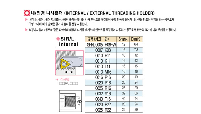 [´ë±¸ÅØ] ³»/¿Ü°æ ³ª»ç Ȧ´õ (INTERNAL/EXTERNAL THREADING HOLDER) SIR/L 0005 H06-W ~ SIR/L 0016 P16