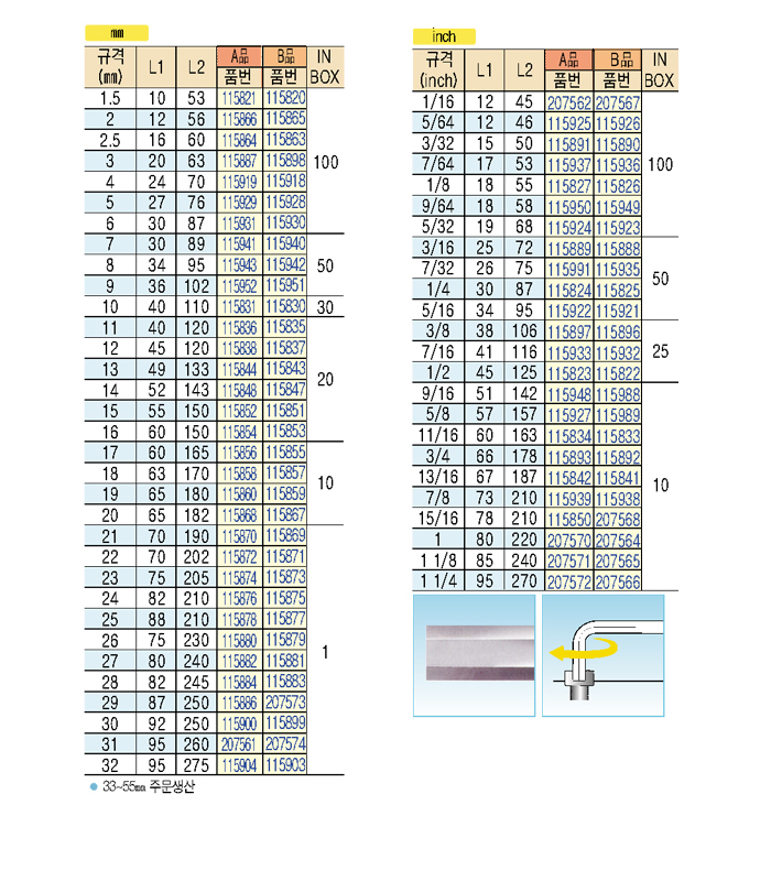 [»ïÁ¤]LÇü ·»Ä¡(L-WRENCH)(°íź¼Ò °ø±¸°­) 1.5 mm ~ 9 mm