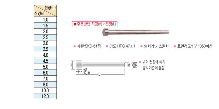 [dz°­]¹ØÇÉ SKD-61Á¾(EJECRTOR PIN)(ÀüÀå L 150) 1.0 d ~ 6.0 d
