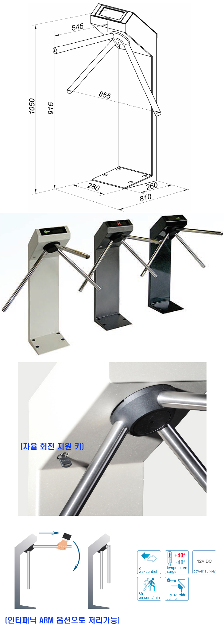 The turnstiles are operated from the remote control panel and can be easily integrated into most access control systems. After each passage the barrier arms are automatically returned to home position. Smoothness of reset is ensured by the damper. The arm rotation sensors track passages through the turnstile to ensure accurate count inputs to access control systems for reports generation.
