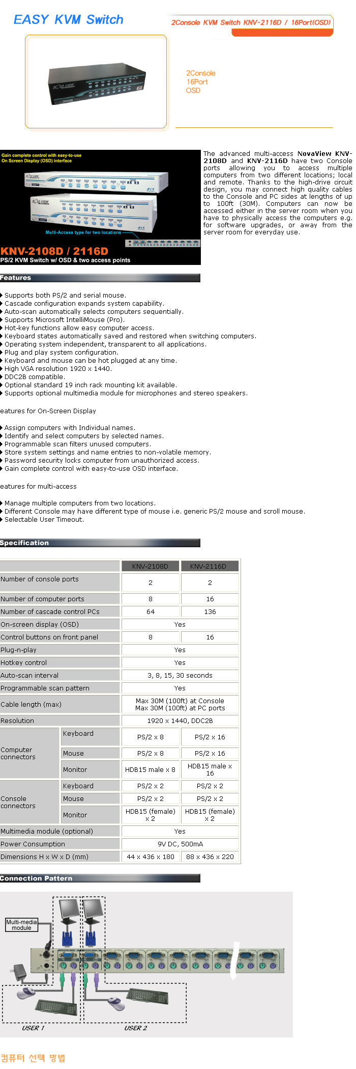 [½Ã½º¶óÀÎ] EASY KVM Switch 2Console KVM Switch KNV-2116D / 16Port(OSD)