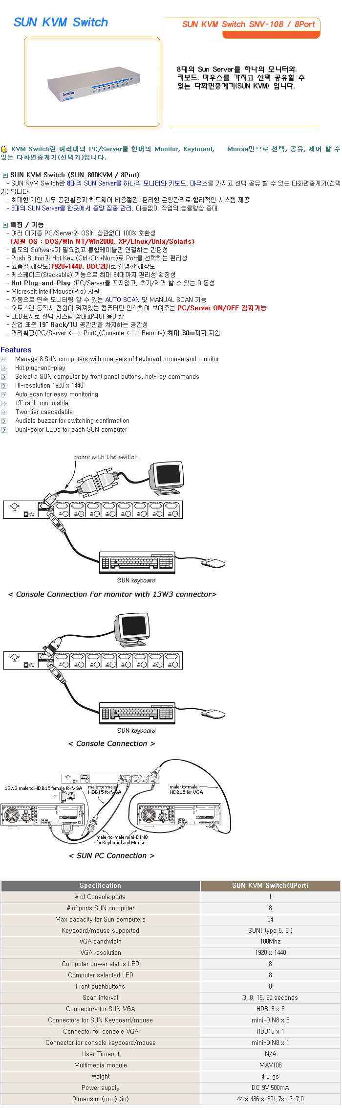 [½Ã½º¶óÀÎ] SUN KVM Switch SUN KVM Switch SNV-108 / 8Port