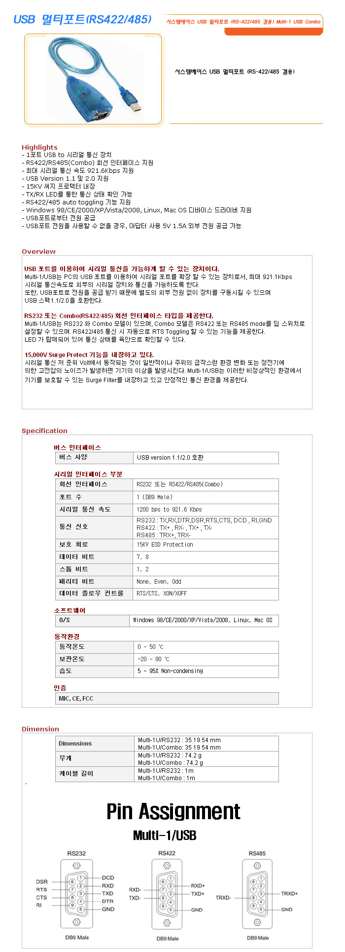 [½Ã½º¶óÀÎ] B ¸ÖƼÆ÷Æ®(RS422/485) ½Ã½ºÅÛº£À̽º USB ¸ÖƼÆ÷Æ® (RS-422/485 °â¿ë) Multi-1 USB Combo