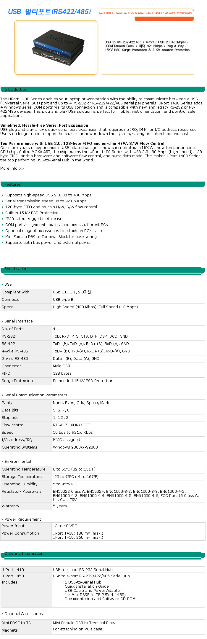 [½Ã½º¶óÀÎ] B ¸ÖƼÆ÷Æ®(RS422/485) 4port USB to Serial Hub 2 KV Isolation UPort 1450-I / 4Port(RS-232/422/485