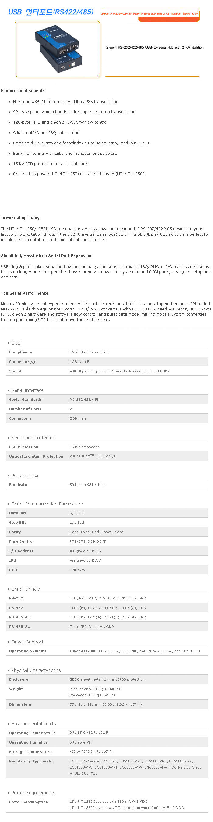 [½Ã½º¶óÀÎ] B ¸ÖƼÆ÷Æ®(RS422/485) 2-port RS-232/422/485 USB-to-Serial Hub with 2 KV Isolation Uport 1250i