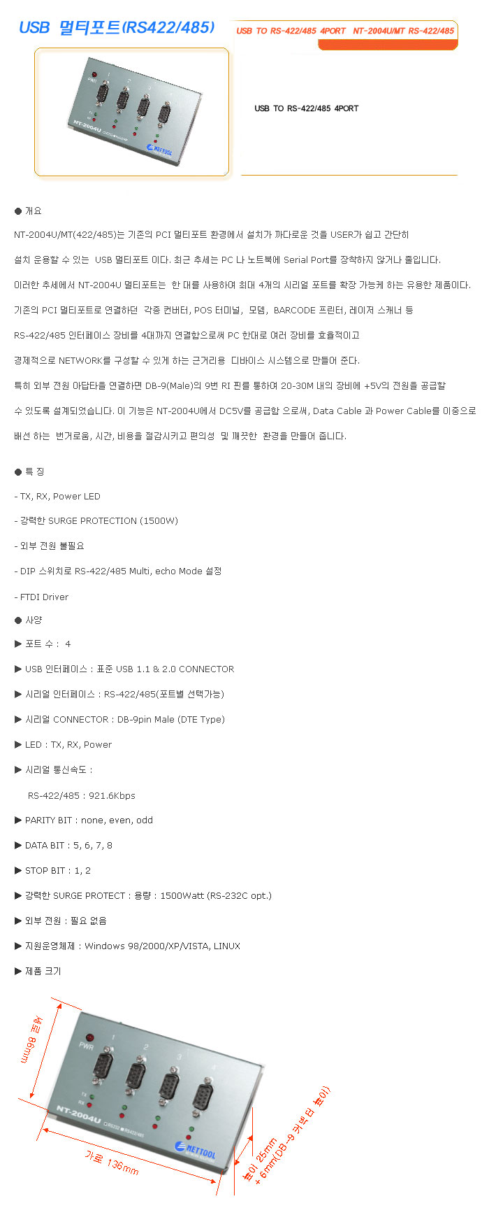 [½Ã½º¶óÀÎ] B ¸ÖƼÆ÷Æ®(RS422/485) USB TO RS-422/485 4PORT NT-2004U/MT RS-422/485