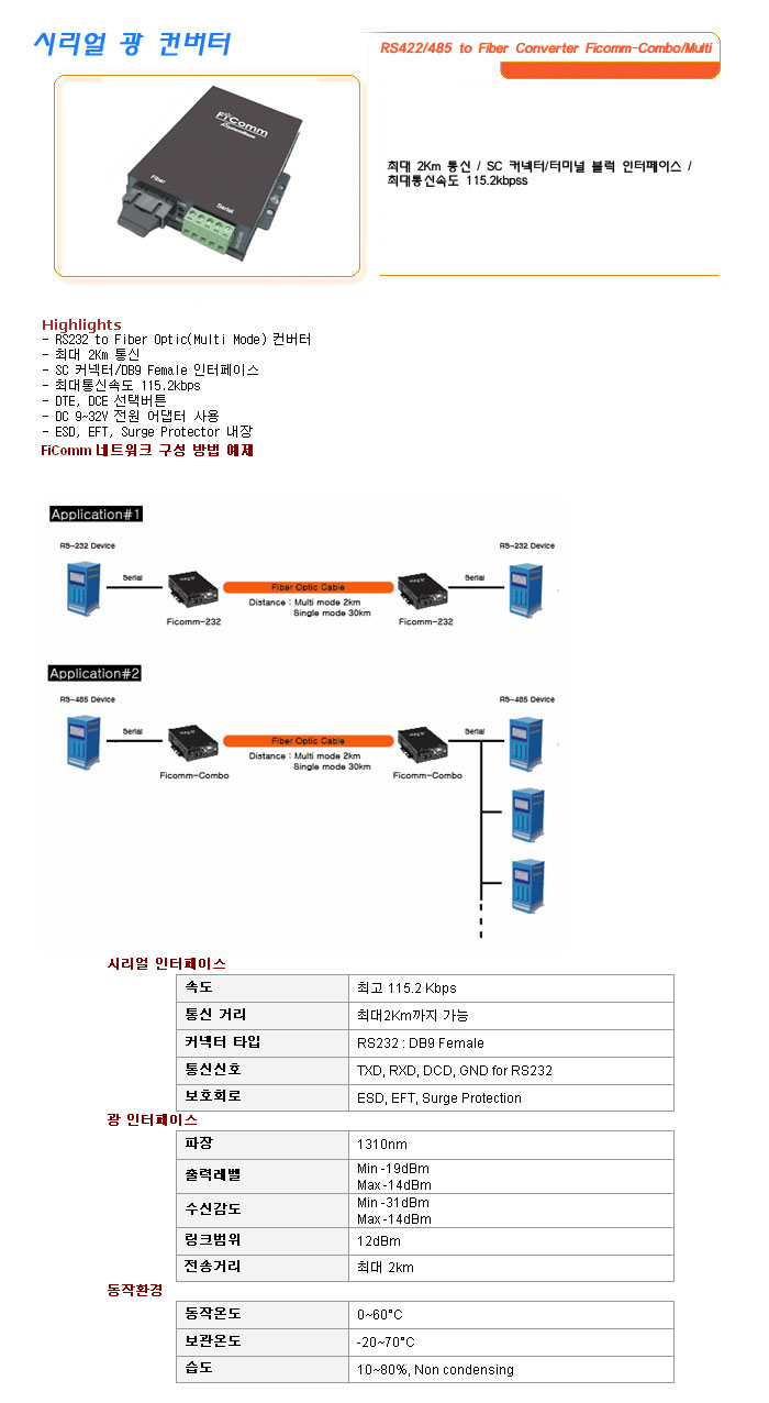 [½Ã½º¶óÀÎ] ½Ã¸®¾ó ±¤ ÄÁ¹öÅÍ RS422/485 to Fiber Converter Ficomm-Combo/Multi