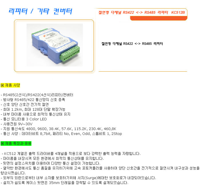 [½Ã½º¶óÀÎ] ¸®ÇÇÅÍ / ±âŸ ÄÁ¹öÅÍ Àý¿¬Çü ´Ùä³Î RS422 <-> RS485 ¸®ÇÇÅÍ KC512B