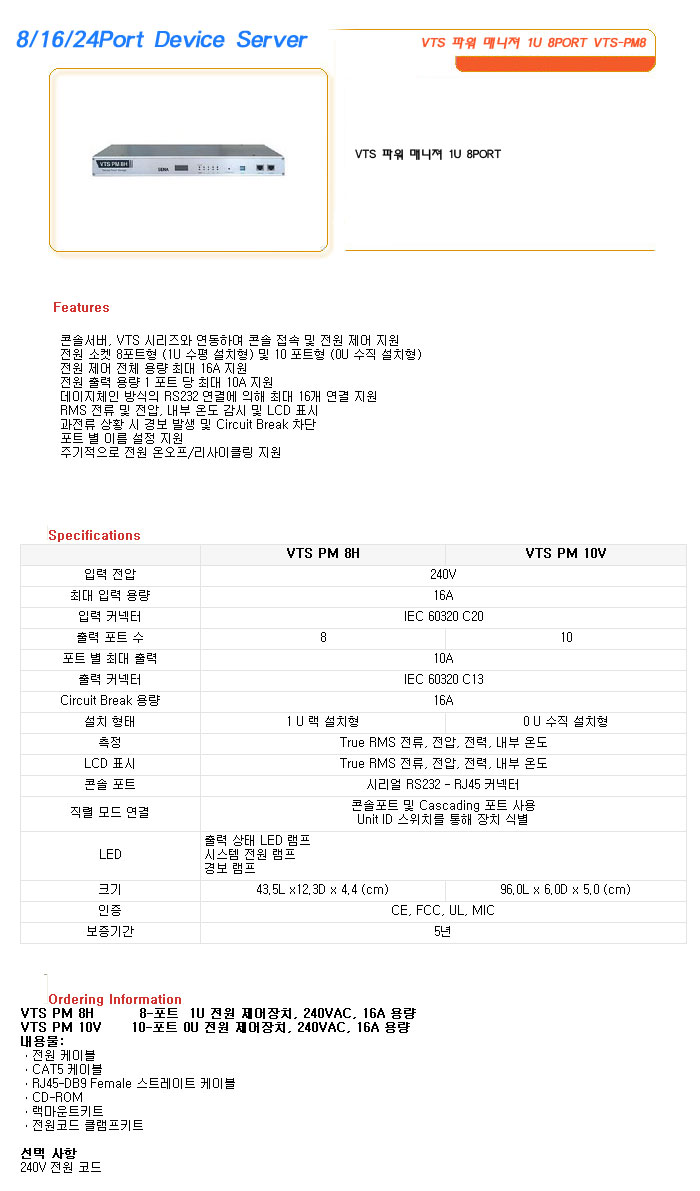 [½Ã½º¶óÀÎ] 8/16/24Port Device Server VTS ÆÄ¿ö ¸Å´ÏÁ® 1U 8PORT VTS-PM8