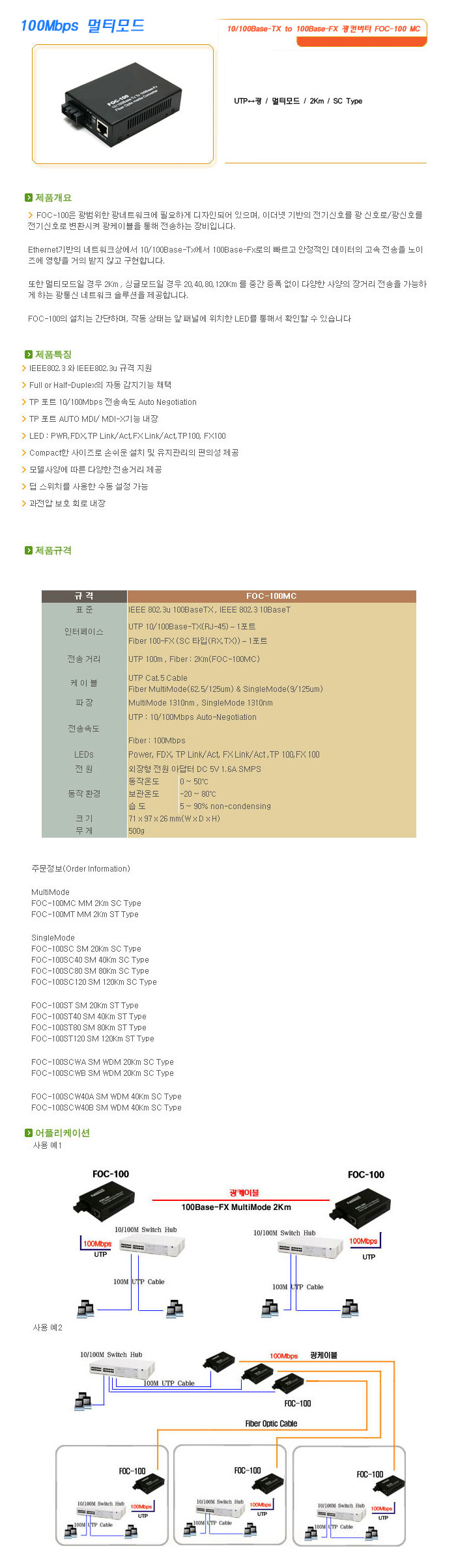 [½Ã½º¶óÀÎ] 100Mbps ¸ÖƼ¸ðµå 10/100Base-TX to 100Base-FX ±¤ÄÁ¹öÅÍ FOC-100 MC