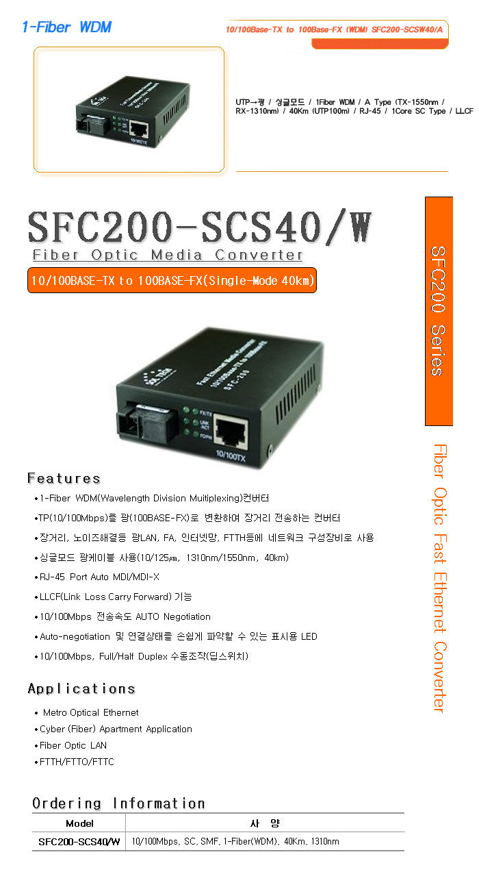 [½Ã½º¶óÀÎ] 1-Fiber WDM 10/100Base-TX to 100Base-FX (WDM) SFC200-SCSW40/A