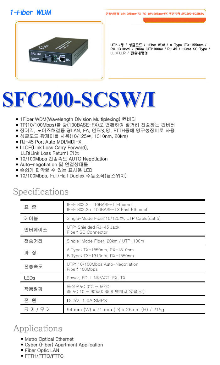 [½Ã½º¶óÀÎ] 1-Fiber WDM Àü¿ø³»ÀåÇü 10/100Base-TX TO 10/100Base-FX ±¤ÄÁ¹öÅÍ SFC200-SCSW/IA