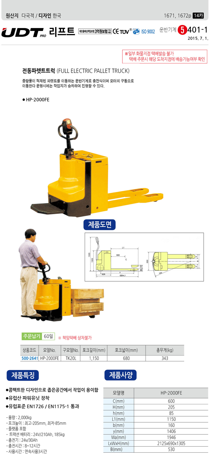 [UDT] Àüµ¿ ÆÄ·¿Æ® Æ®·°(HP-2000FE/TK20L, 2.0Ton, ž½Â ÁÖÇà ¹× ¸®ÇÁÆÃ ÀÚµ¿)(Full Electric Pallet Truck)(ÁÖ¹®Ç°)=>Á¦Ç°´ÜÁ¾!