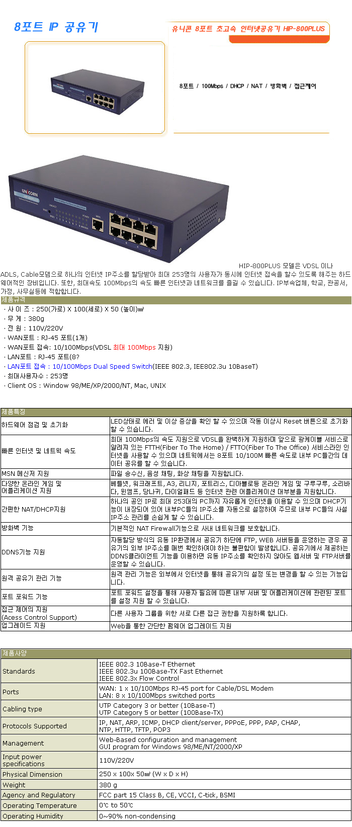 [SL] À¯´ÏÄÜ 8Æ÷Æ® Ãʰí¼Ó ÀÎÅͳݰøÀ¯±â HIP-800PLUS=>Á¦Ç°´ÜÁ¾!