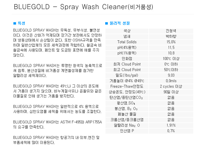 Blue Gold Spray Wash contains absolutely NO silicone defoamers and is completely free-rinsing, which is essential for any post cleaning operation such as painting or phosphatizing. It does not contain any metal or metal compounds, no halogenated hydrocarbons, no chlorinated hydrocarbons, no aromatic carbon compounds and no amines or nitrates.