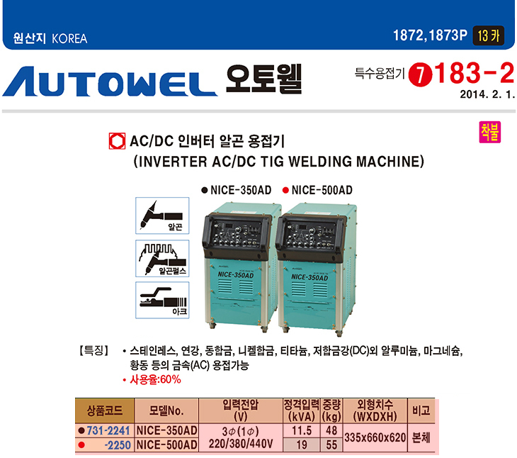 [¿ÀÅäÀ£] AC/DC ÀιöÅÍ ¾Ë°ï ¿ëÁ¢±â(NICE-500AD, »ï»ó220/380/440V, 19.0KVA)(Inverter AC/DC TIG Welding Machine)