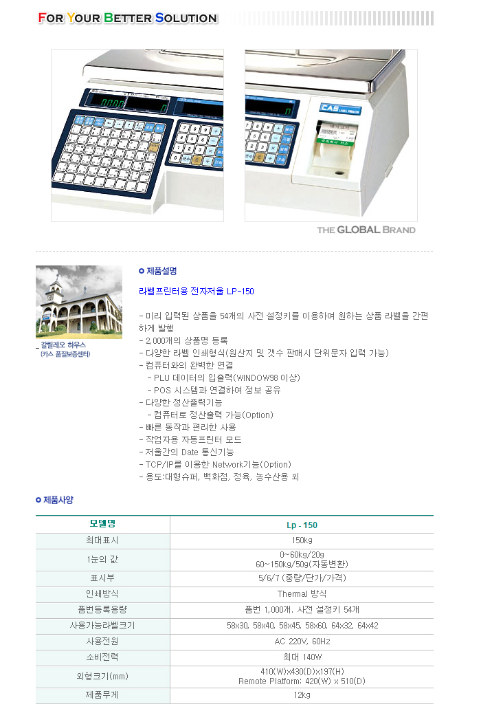 [CAS]À¯ÅëÇü ÀüÀÚÀú¿ï LP-150(1.7V)(¶óº§ÇÁ¸°ÅÍ Ãâ·ÂÇü)/(ÃÖ´ëÁß·® 150Kg, ÃøÁ¤Á¤µµ 20g)/(Label Printing Retail Computing Scale)