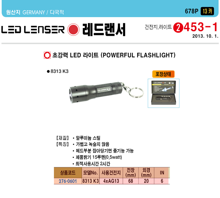 [·¹µå·£¼­] Ãʰ­·Â LED ¶óÀÌÆ®(8313 K3, AG13x4°³, 68x20mm, ¿­¼è°í¸®Çü, 15·ç¸à/0.5Watt)(Powerful Flashlight)=>Á¦Ç°´ÜÁ¾!