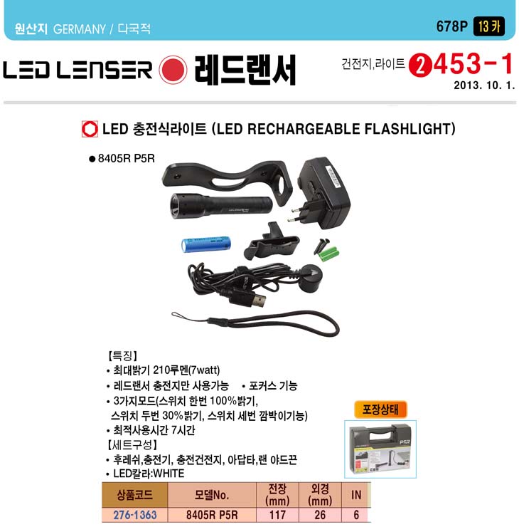 [·¹µå·£¼­] LED ÃæÀü½Ä ¶óÀÌÆ®(8405R P5R ÃæÀü½Ä, 210·ç¸à/7.0Watt)(LED Rechargeable Powerful Flashlight)