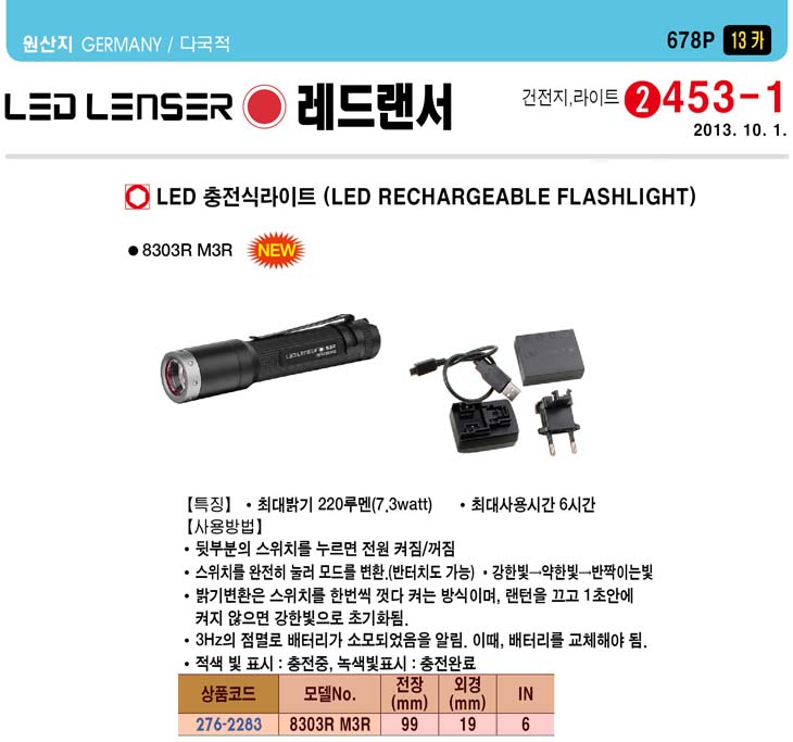 [·¹µå·£¼­] LED ÃæÀü½Ä ¶óÀÌÆ®(8303R M3R ÃæÀü½Ä, 220·ç¸à/7.3Watt)(LED Rechargeable Powerful Flashlight)=>Á¦Ç°´ÜÁ¾!