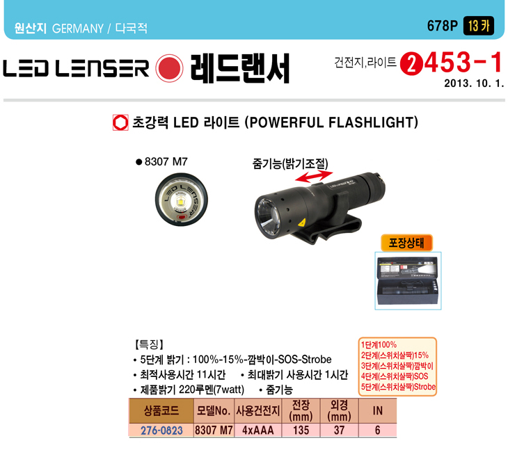 [·¹µå·£¼­] Ãʰ­·Â LED ¶óÀÌÆ®(8307 M7, AAAx4°³, 135x37mm, 200·ç¸à/7.0Watt)(Powerful Flashlight)