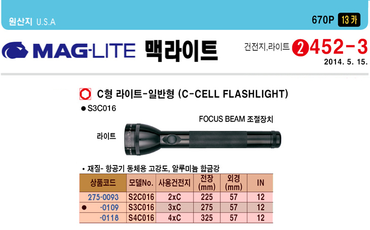 [¸Æ¶óÀÌÆ®] CÇü ¶óÀÌÆ® ÀϹÝÇü ·£ÅÏ/¼ÕÀüµî/ÈÄ·¹½¬(S3C016 3xC 275x57mm C-CELL FLASHLIGHT, Æ÷Ä¿½ººö)(¹èÅ͸®´Â Á¦¿Ü)
