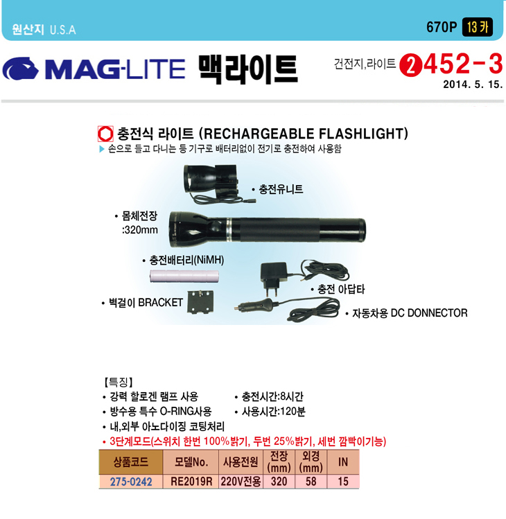 [¸Æ¶óÀÌÆ®]ÃæÀü½Ä ¶óÀÌÆ®(RE2019R, 220VÀü¿ë, 320x58mm)(ÃæÀü½Ä ·£ÅÏ/ÈÄ·¹½¬/¼ÕÀüµî/¶óÀÌÆ®)(RECHARGEABLE FLASHLIGHT)=>Á¦Ç°´ÜÁ¾!
