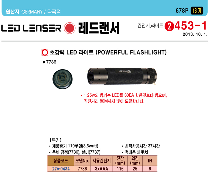 [·¹µå·£¼­] Ãʰ­·Â LED ¶óÀÌÆ®(7736, AAAx3°³, 116x25mm, °ËÁ¤»ö, 110·ç¸à/3.6Watt)(Powerful Flashlight)=>Á¦Ç°´ÜÁ¾!