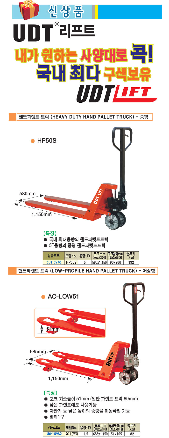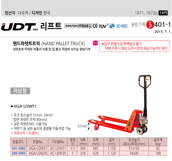 [UDT] ÇÚµå ÆÄ·¿Æ® Æ®·° Àú»óÇü(HGA-LOW51/AC-LOW51, 1.5Ton)(Hand Pallet Truck)