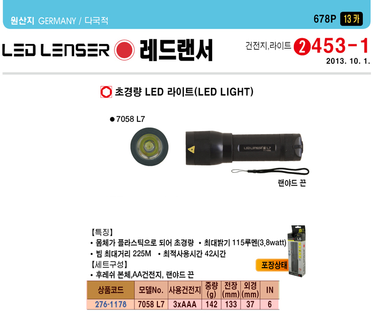 [·¹µå·£¼­] Ãʰ淮 LED ¶óÀÌÆ®(7058 L7, AAx2°³, 133x37mm, 115·ç¸à/3.8Watt)(LED Flashlight)