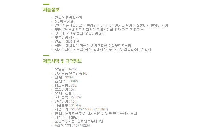 [º¸Èï] ¾÷¹«¿ë/¿µ¾÷¿ë 2¸ðÅÍ Áø°øÃ»¼Ò±â(S-702, °Ç½Ä/½À½Ä °â¿ë, 70¸®ÅÍ, 1350Watt x 2°³)(Vacuum Cleaner)