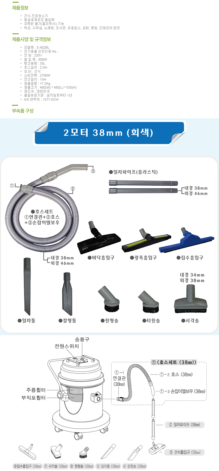 [º¸Èï] ÈíÀÔ/¼Ûdz±â´É 2¸ðÅÍ Ã»¼Ò±â(S-402BL, °Ç½Ä¸ðµ¨, 40¸®ÅÍ, 1350Watt x 2°³)(Vacuum Cleaner)=>Á¦Ç°´ÜÁ¾!