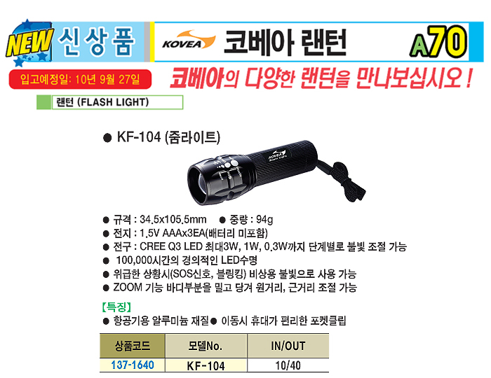 [ÄÚº£¾Æ] ·£ÅÏ(FLASH LIGHT)(KF-104, ÁܶóÀÌÆ®, 1.5VAAx3°³)(¹èÅ͸®¹ÌÆ÷ÇÔ):ÀϽÃǰÀý!!