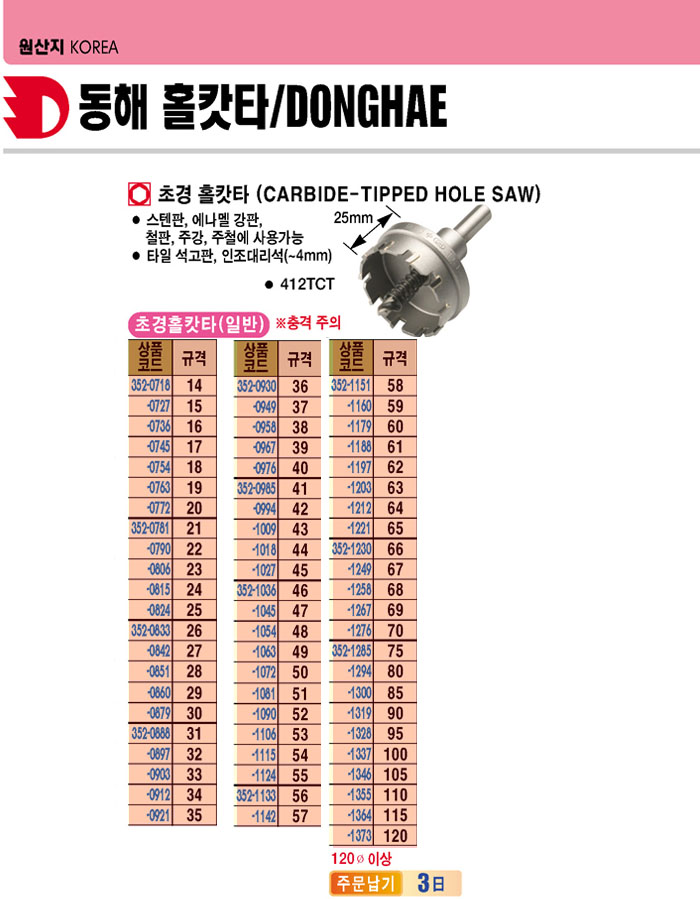 [µ¿ÇØ]Ãʰæ ȦıŸ(Carbide Tipped Hole Saw)(75 ©ª)(½ºÅÙ, ¿¡³ª¸á°­ÆÇ, öÆÇ,ÁÖ°­, ÁÖö, ŸÀϼ®°íÆÇ, ÀÎÁ¶´ë¸®¼® 4.0mmÀÌÇÏ ÀÚÀç)